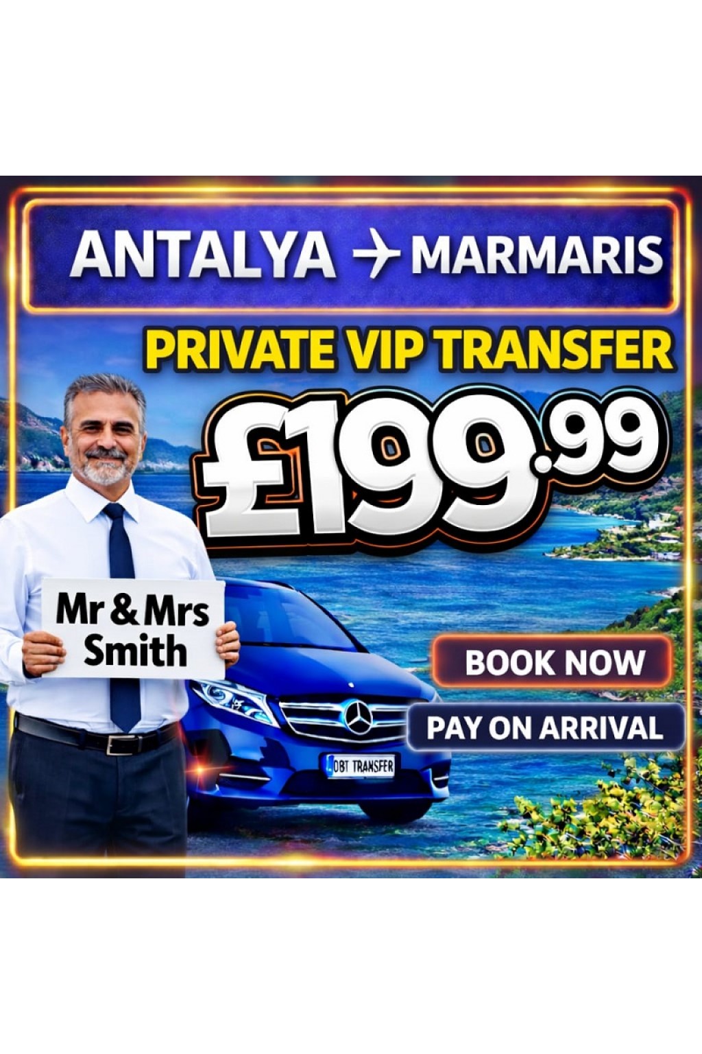Your driver waits at Antalya Airport arrivals holding a name sign.