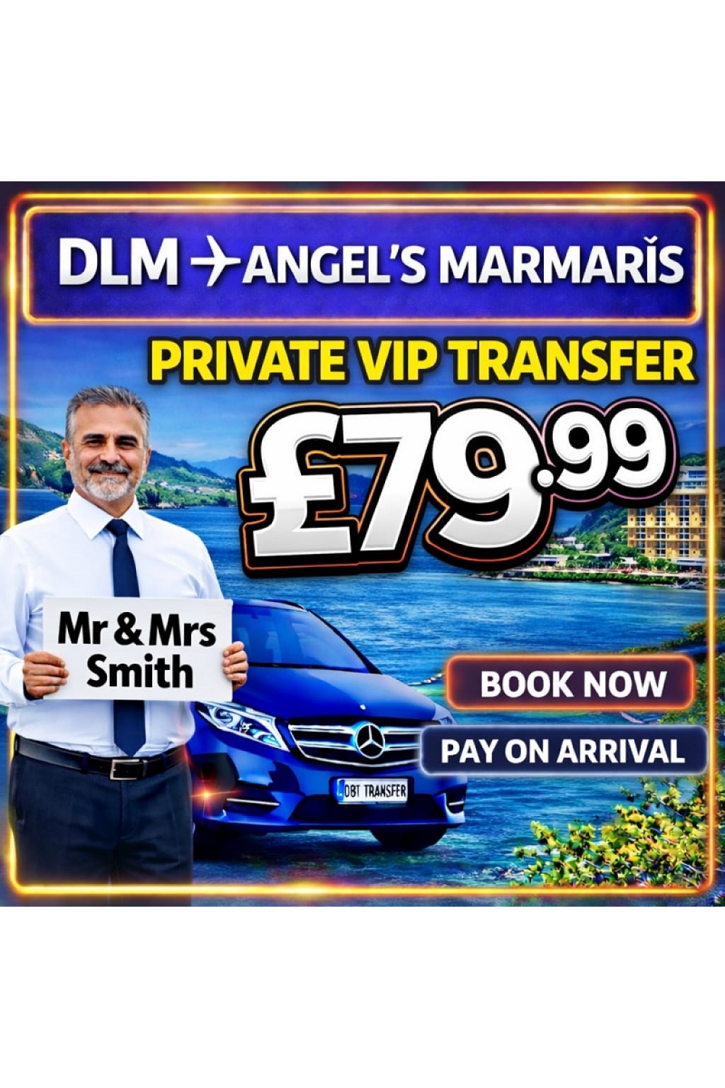 Your driver waits at Dalaman Airport arrivals holding a name sign.